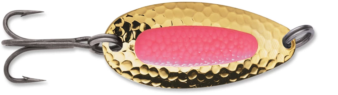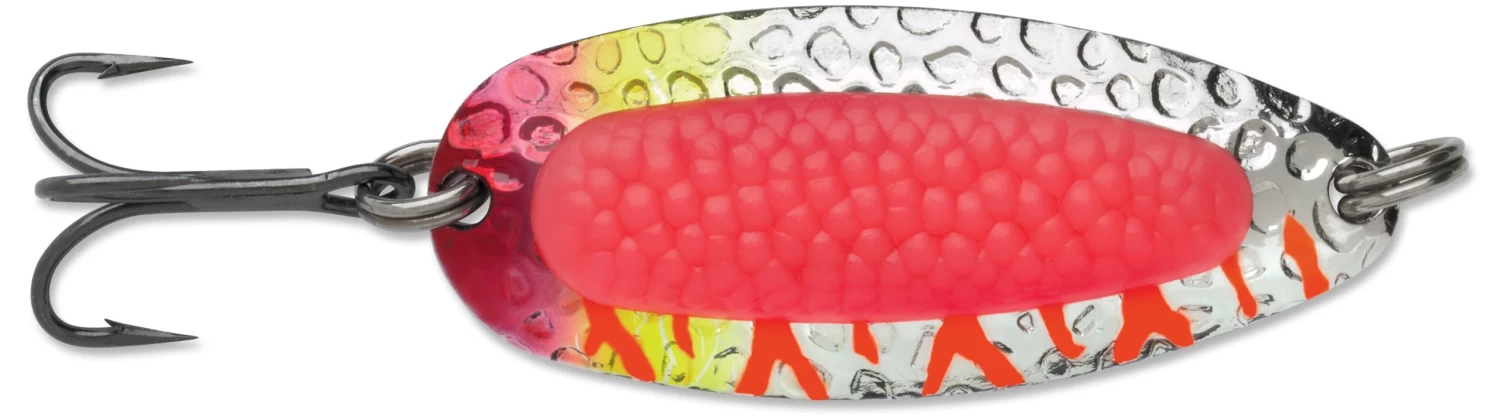 Blue Fox Pixee Spoon features heavy-duty construction that allows long casts and deep retrieves even in fast moving water. It really lures ’em in with a dazzaling sparkle of flashes emitted from the hammered spoon. A plastic insert designed to add a natural touch by imitating a cluster of fish eggs. Rigged with extremely sharp VMC black nickel treble hooks for excellent penetration and flawless hooksets. Includes a properly sized siwash hook as well. Available in a wide range of colors, you can choose from UV, nickel plated, gold plated, painted and metallic finishes.