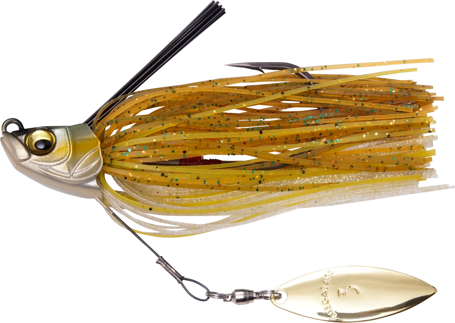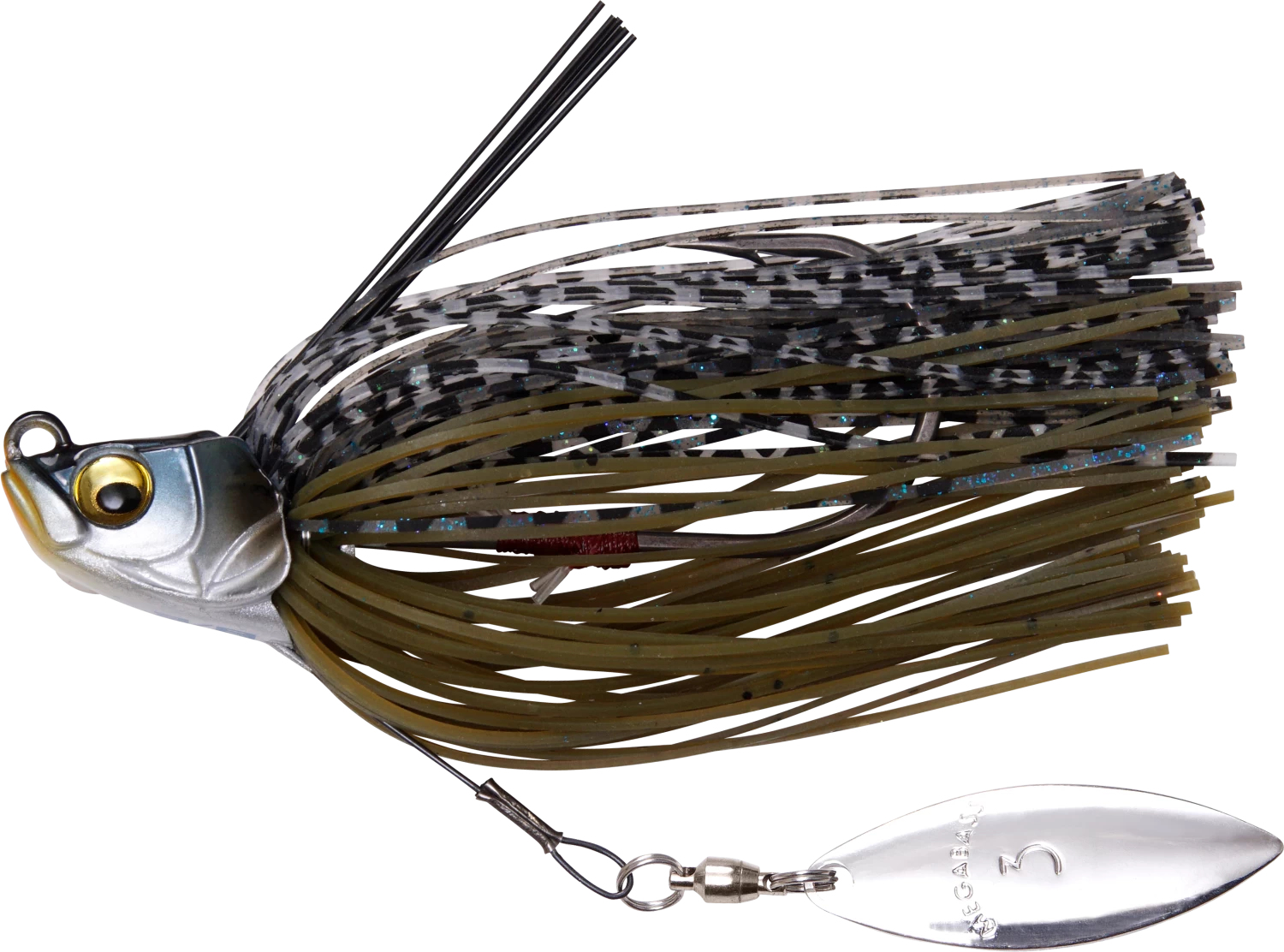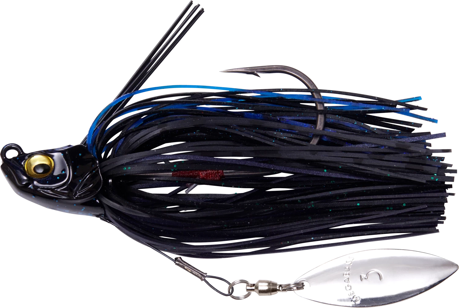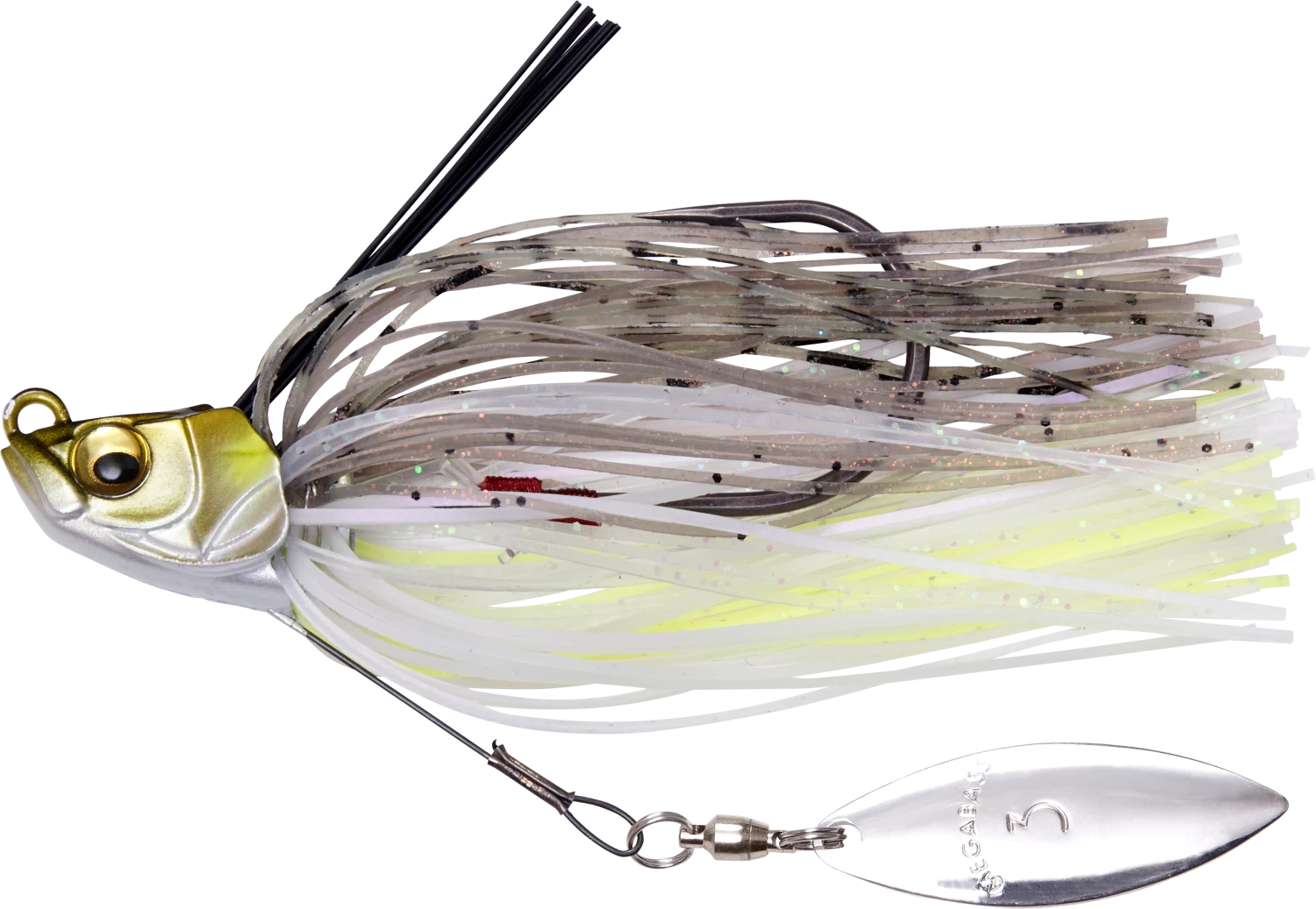 It features a bright #3 Willow blade anchored in place by a shape-memory wire, offering a brilliant dose of flash and vibration. This titanium wiring, along with the tension-tuned weedguard compress out of the way when big bass strike to help facilitate the penetration of the stout, fluorine-coated wide-gap hook. Hand-tied premium silicone skirt rounds out this amazing swim jig.