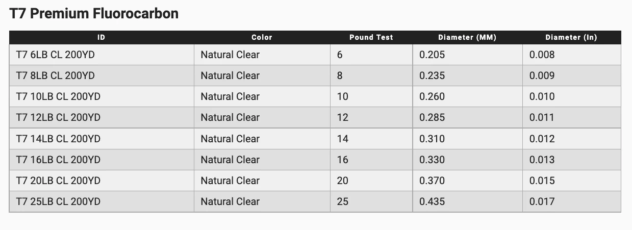| Line Diameter | 6 lb | 8 lb | 10 lb | 12 lb | 14 lb | 16 lb | 20 lb | 25 lb |